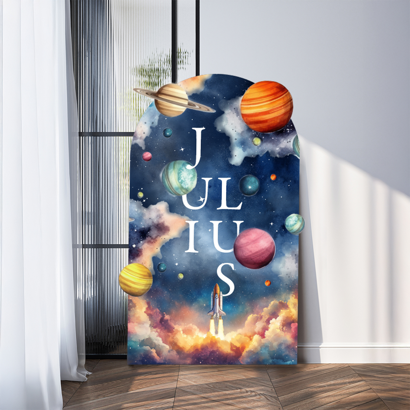 Laat de jongenskamer tot leven komen met Ruimtereis, het betoverende droomvenster van CoiCoi. Dit gepersonaliseerde kinderkamer schilderij geeft een magische blik in de ruimte en toont de planeten Mercurius, Venus, Aarde, Mars, Jupiter, Saturnus, Uranus en Neptunus in prachtige kleuren. Onze wanddecoratie wordt volledig gepersonaliseerd: de naam van jouw kind wordt stoer maar stijlvol verwerkt in het ontwerp. Een krachtige raket vliegt door zijn naam heen en maakt het geheel avontuurlijk en uniek. Deze wanddecoratie zorgt ervoor dat de kinderkamer in een oogwenk geüpgraded is. Ruimtereis is de perfecte combinatie van fantasie, ontdekking en stijl. Een echte blikvanger voor elke jonge ruimte-avonturier.