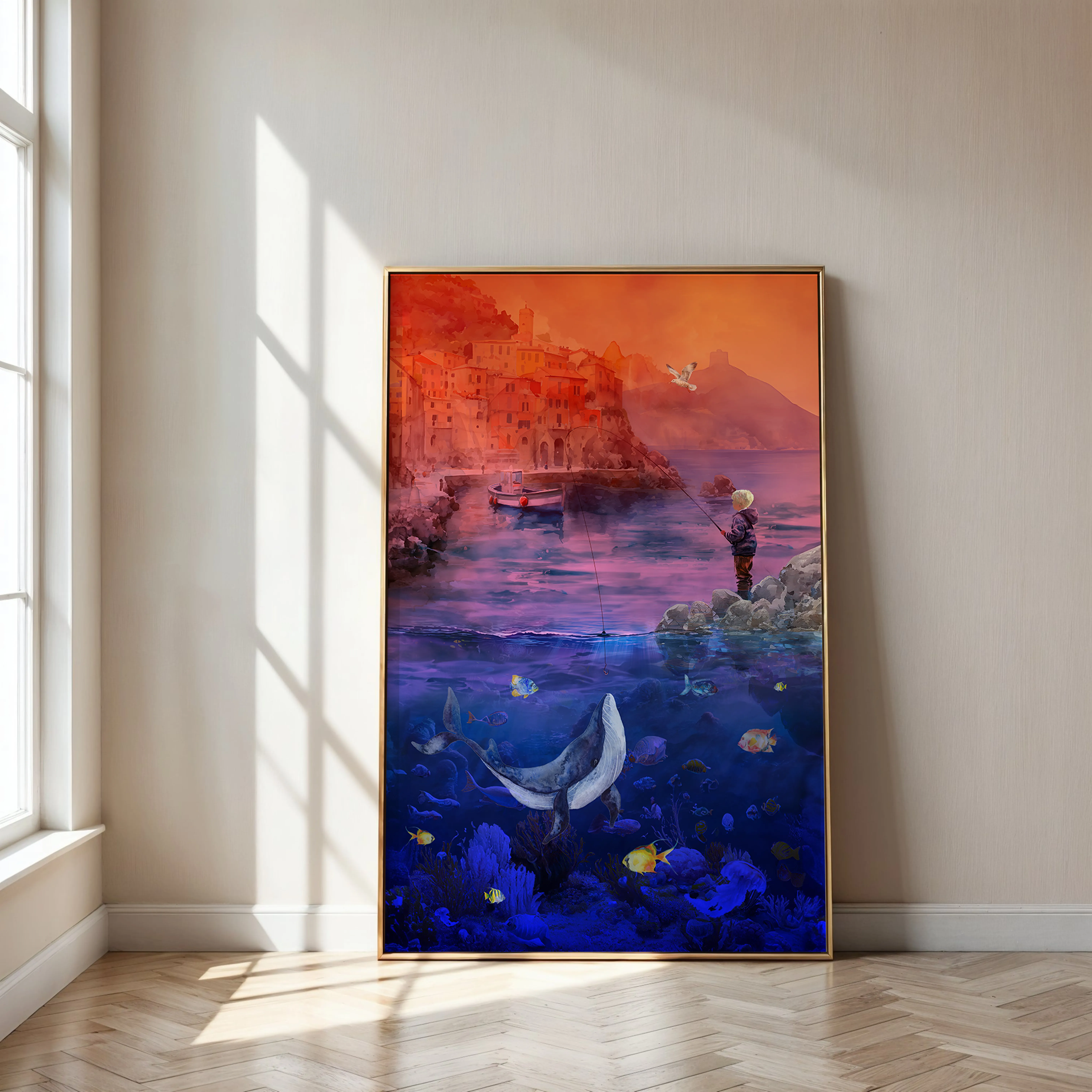 Laat jouw kind zelf schitteren in dit onderwateravontuur. Wij verwerken het gezichtje van jou kind in het schilderij. Zo wordt Vissersavontuur een uniek en persoonlijk kunstwerk waarin je kind zijn of haar zee-dromen kan beleven.